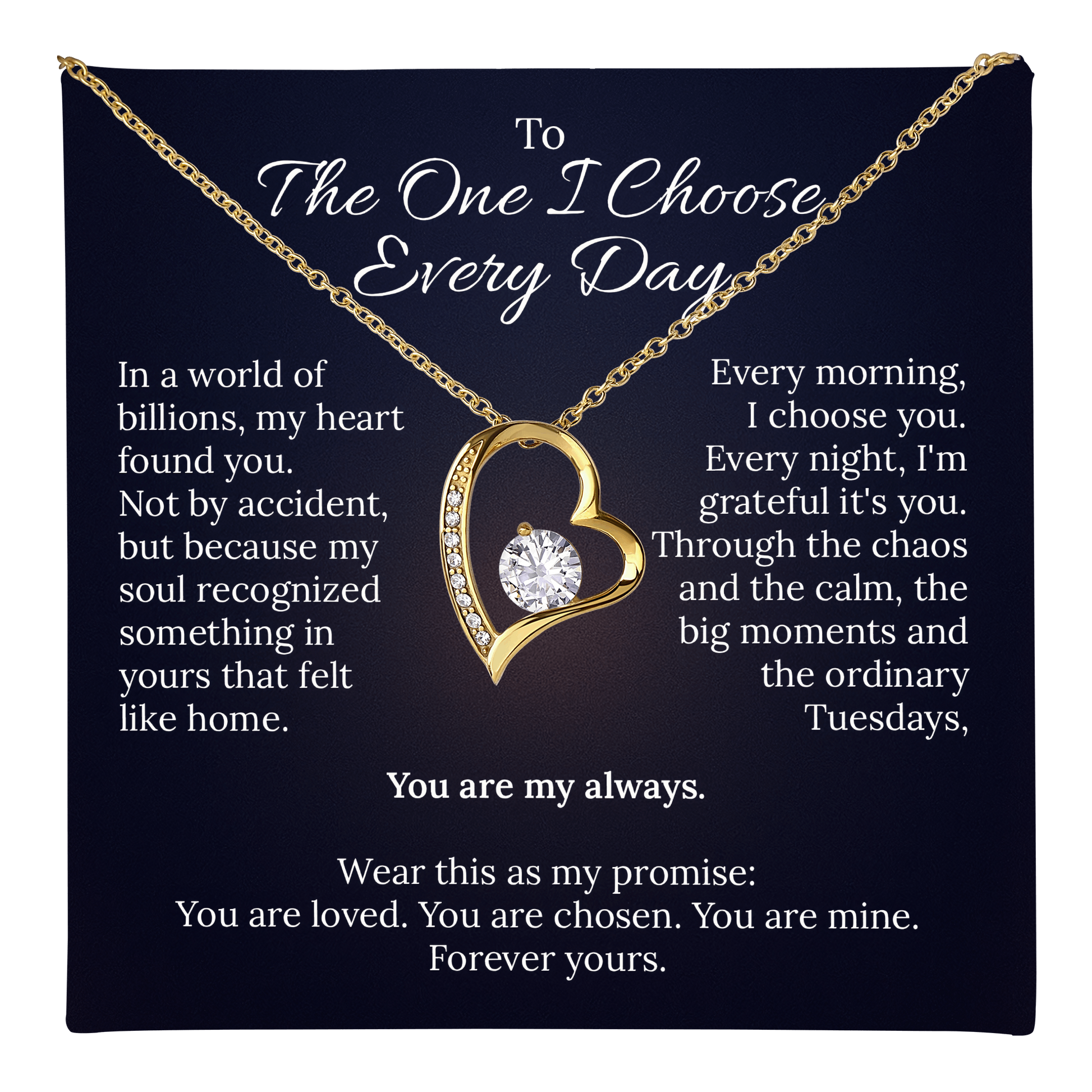 "In a world of billions, my heart found you... Wear this as my promise: You are loved. You are chosen. You are mine. Forever yours."